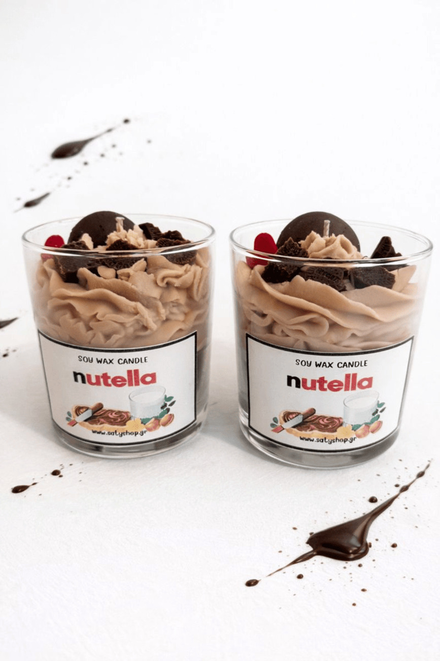 Απόλαυσε την απόλυτη “γλυκιά” ατμόσφαιρα με το χειροποίητο κερί σόγιας Nutella! Με ζεστές, σοκολατένιες νότες και κρεμώδη αίσθηση φουντουκιού, γεμίζει τον χώρο με ένα λαχταριστό άρωμα που θυμίζει φρεσκοανοιγμένο βαζάκι πραλίνας.